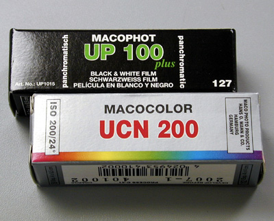 問題は使用するフィルムですが、現在は弊社および早田カメラ店では、ドイツのマコ社が製造しているカラーネガフィルム、マコカラー UCN200(ISO200 735円)とモノクロネガフィルム、マコフォトUP100(ISO100 630円)を販売しており、これらのフィルムで撮影を楽しむことができます。以前はカラーリバーサルのマコクロームUCR100もあったのですが、現在は 製造中止となっております。