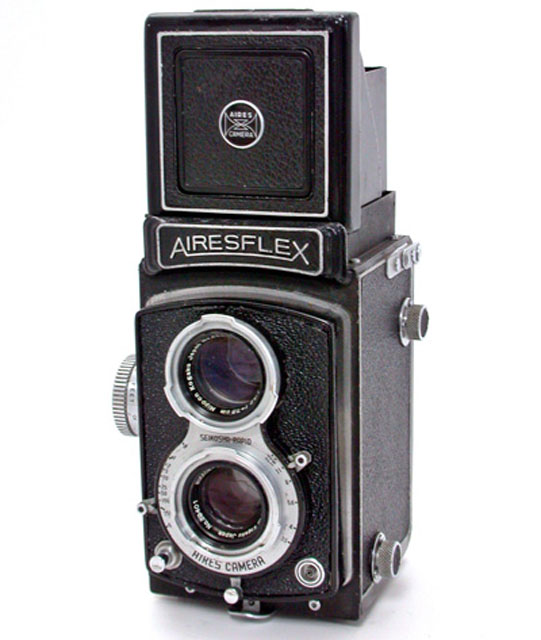 アイレス写真機製作所は1950年(昭和25年)8月に創立され、その翌月に最初のカメラとして6x6cm判二眼レフのアイレス フレックスY型を発表しました。折から日本では二眼レフカメラのブームが始まり、この波にのってアイレスフレックスの販売は好調なすべり出しをみせたそう です。しかし二眼レフの大ブームが到来すると数多くの大小メーカーが乱立して乱売合戦を繰り広げるようになりました。その中でぬきんでた特徴を出すことを 考えていたアイレスは、当時世界的な脚光を浴びつつあった日本光学工業のニッコールレンズの採用に成功したのでした。