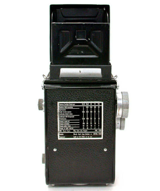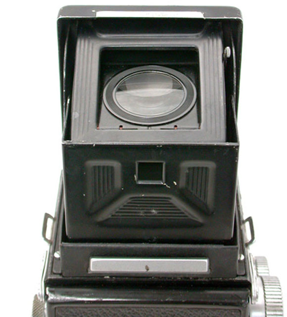 ファインダー側のレンズはビュー・ニッコールmmF3.2と撮影レンズ側より明るく、ピント合わせを容易にしているところもロー ライコード譲りです。特にピントルーペを出した時、ファインダー全体をカバーで覆うようになっていて、脇からの迷光でファインダースクリーンが見にくくな ることを防いでいるのは、本家ローライコードよりも優れていると言えるでしょう。