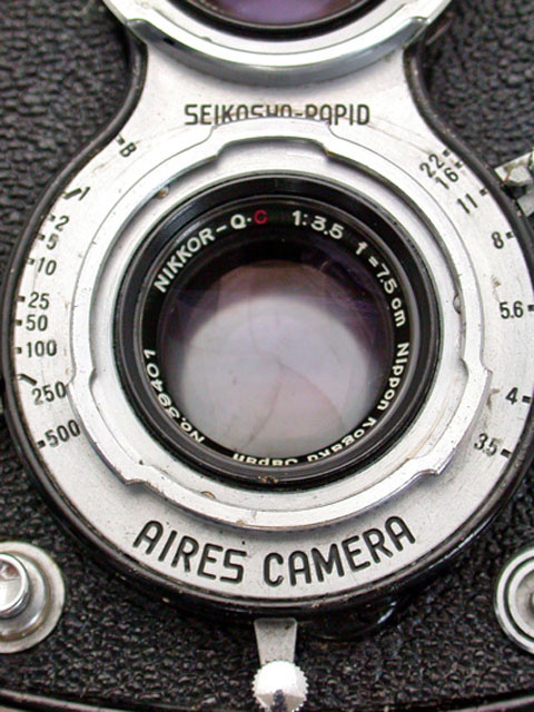 そもそも日本光学自身、戦争後に民生用カメラへの参入を決意した際、当時大ブームになりかけていた6x6cm判二眼レフカメラの 開発を検討しましたが、製造上の問題が多く断念したという経緯があったということです。日本光学は天下のニッコールレンズをアイレスに供給するに当たり、 ボディ側の精度や品質を日本光学の自社基準に合致することを求め、これがアイレス写真機製作所の技術力を大幅に向上させることにつながっていったそうで す。アイレスフレックスの4作目アイレスフレックスZのシリーズ最上位機種に、ニッコールQ75mmF3.5レンズが装着されて登場したのは1951年 (昭和26年)9月のことでした。