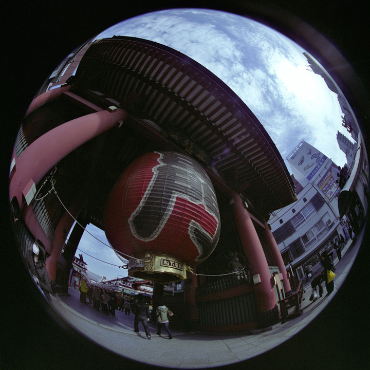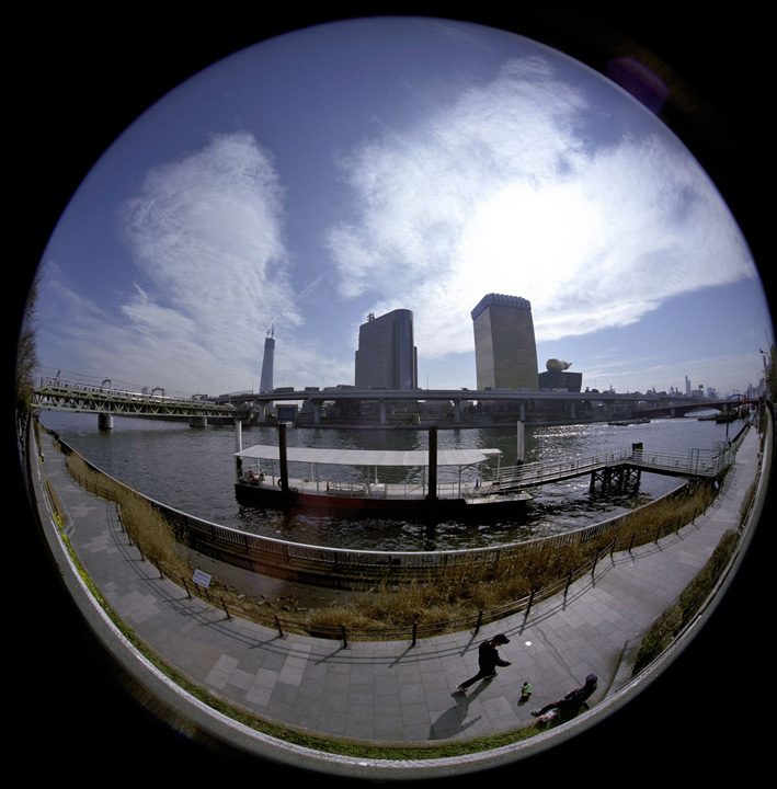 | コーワシックス(初代)に装着されたフィッシュアイ・コーワ19mmF4.5レンズ | 作例1 隅田川 1/250 F11 作例写真 フィルムはすべてフジ・160Sプロ |