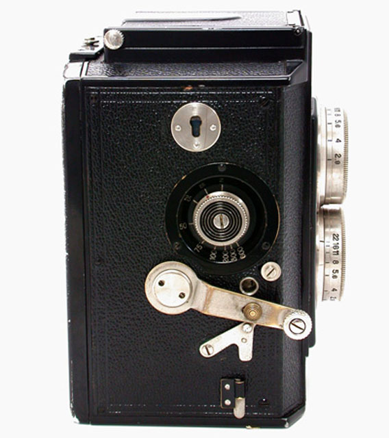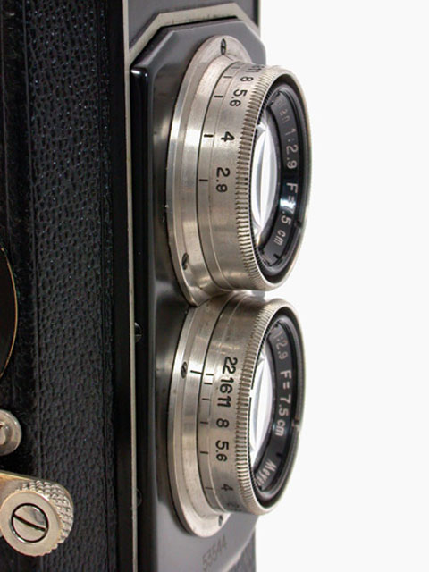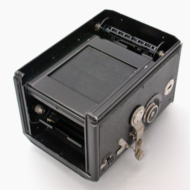 もうひとつおもしろい点は、ビューレンズに撮影レンズと同期する絞り機構をいれたことです。これによってファインダーで絞りによ る被写界深度の変化を見ることができるのですが、ある程度以上に絞り込んでしまうとスクリーンが暗くなってしまうため、構図を確認することが困難になって しまうという問題が生じてしまいます。この問題を解決するため、ボディの左側面に光学式のファインダーを組み込んであり、必要なときにバネで飛び出して観 察できるようになっています。ビューレンズに絞りを入れた二眼レフカメラは、世界的に見ても数がたいへん少ないのですが、このように使用上の難点があった ためだと思います。