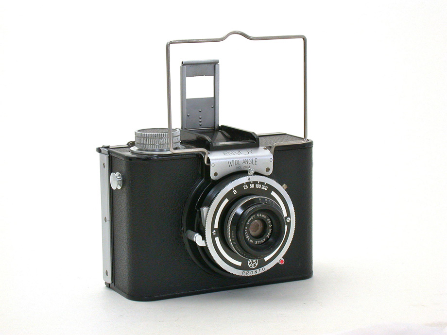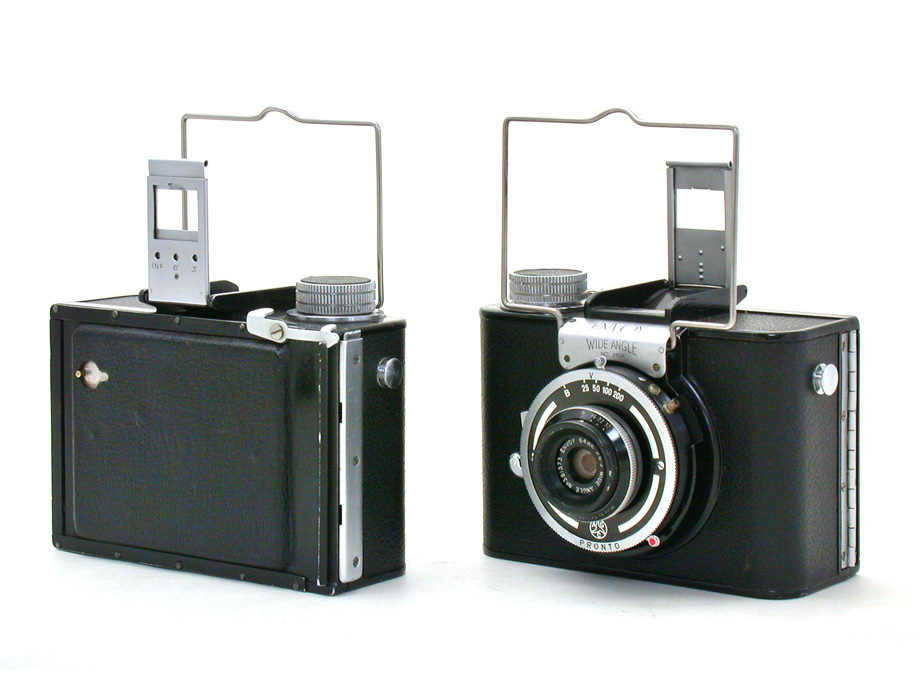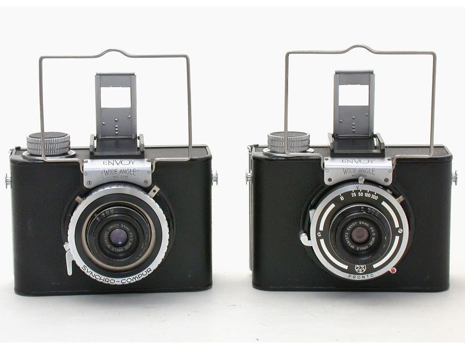 エンボイ・ワイドアングル(Envoy Winde Angle)はイギリスのフォト・デベロップメンツ社(Photo Devevlopments LTD.)が1950年頃に発売した、6x9cmフォーマットで64mmレンズにより画角82度(35mm判換算で25mmレンズ相当)の撮影が可能な広角専用カメラです。120判あるいは620判ロールフィルムを使用して8コマ撮影できます。当時は乾板で1枚撮りすることも可能で、フード付きのピントグラスも用意されていました。
