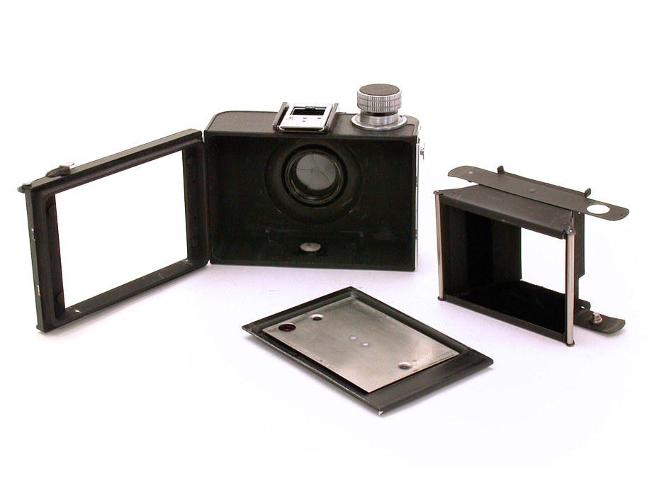 写真でお分かりいただけるように、とてもシンプルな構造のカメラで、巻き上げノブを上に引き上げるとボディーは外殻と内枠に分離できます。外殻にはシャッターユニット、レンズ、フレームファインダーが取り付けられ、内枠にはフィルムを装填します。裏蓋の赤窓でフィルムの位置を定める赤窓方式でフィルムを送ります。いわゆるボックスカメラと構造はほとんど変わりません。全金属製のボディは重量660gですが、6x9cm判のカメラとしては横幅は124mmしかなく、コンパクトで携行しやすい点が大きな魅力です。また操作箇所が少く、撮影がとても迅速にできる点もスナップなどには好適です。
