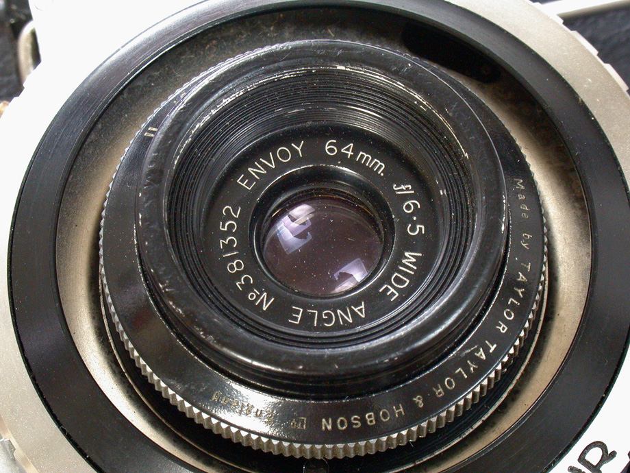 このカメラに装着されているレンズは、イギリスの名門レンズメーカー、テーラー&テーラー・ホブソン社製のエンボイ(Envoy)64mmF6.5で、1950年当時では驚くべき超広角レンズと言えるものでしょう。4群4枚構成で、前玉の直径はわずか約10mmの小さいレンズです。ただしこのレンズは開放のF6.5ではイメージサークルが小さくて画面周辺までカバーできないため、絞りの刻みはF11からはじまり、F16、F22、F32の4点しかありません。またレンズの焦点位置は固定されていて、被写界深度を考慮して無限遠までピントが合うのはF22以上に絞った場合です。絞り開放位置では6~10mあたりにピントの最良点があるように設定されているようですが、手元の2台のカメラでは微妙に異なっています。このレンズの絞り羽根は8枚で、どの位置でもおおむね円形です。