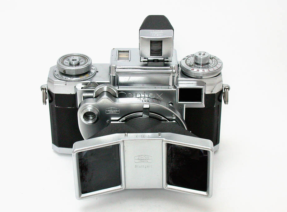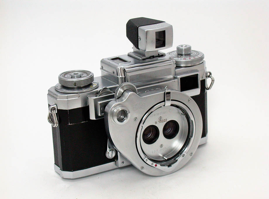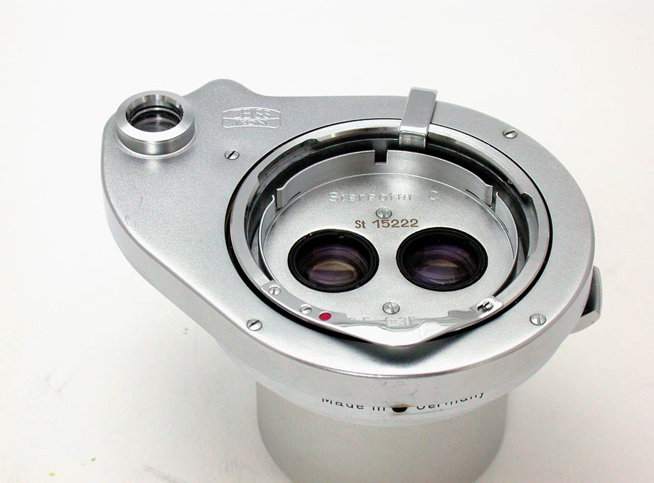 さて、今回ご紹介するのは、ドイツのツァイス・イコン社の名機コンタックス用にカール・ツァイス社が供給したステレオ撮影用交換レンズ、ステレオターC35mmF3.5レンズです。ただし装着できるのは戦後のIIa、IIIaだけです。同じ交換レンズ方式のステレオ撮影レンズとしては、ライカ用のステマーレンズ、ニコンSシリーズカメラ用のステレオ・ニッコールレンズも有名ですが、このステレオターCレンズには、専用の近接撮影用プロクサーレンズとコンタメーターが付属していて、最短20cmの接写ができることが大きな特徴となっています。