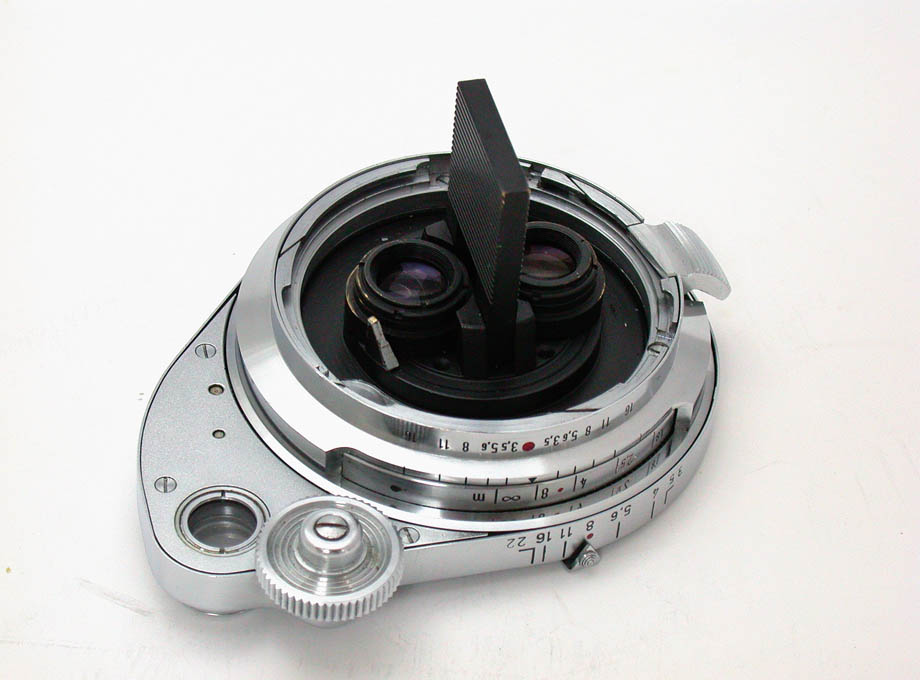 このレンズはとても複雑な構造をしていて、メカ好きの方なら一発で気に入ること間違いなしです。左右に2つ並んでいるレンズは3群3枚構成で、レンズ間の距離は18mmです。レンズはボディの外側のバヨネットマウントに取り付けます。ボディ側の距離計は使用せず、無限遠位置に固定しておきます。レンズに独立したドレーカイルプリズムが備わっていて、これを回転させればファインダーの二重像が移動するとともにレンズが前後し、ピント合わせができるようになっています。このシステムが非常に軽快に作動するため、たいへん使いやすくなっています。