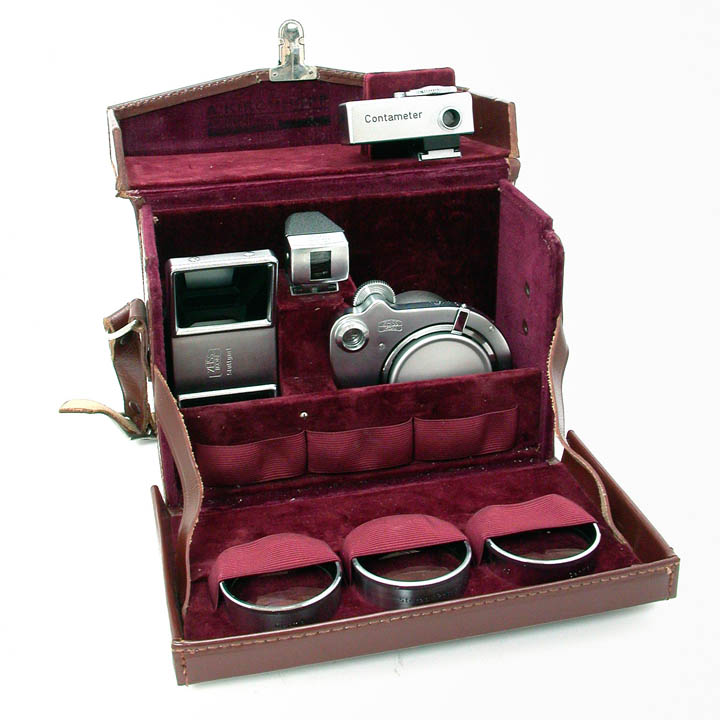 レンズの距離指標には1つの赤点と2つの赤点が打ってありますが、これは専用ファインダーのパララックス補正指標に対応しています。また2.5mのところが赤字になっていますが、それより遠くを撮影する場合にはレンズの前にステレオプリズムを装着して立体感を強調するようにという指示です。プロクサーを使用する場合には、レンズのピント位置を最短位置に固定し、続いて撮影した距離に対応したプロクサーをレンズの前に装着、アクセサリーシューに装着したコンタメーターも対応した距離に設定し、コンタメーターの二重像が合致するところでシャッターを切れば、ピントが正確にあった接写ができるという仕組みです。文章で説明すると複雑ですが、実際に操作してみると、とても良くできていることに感心します。