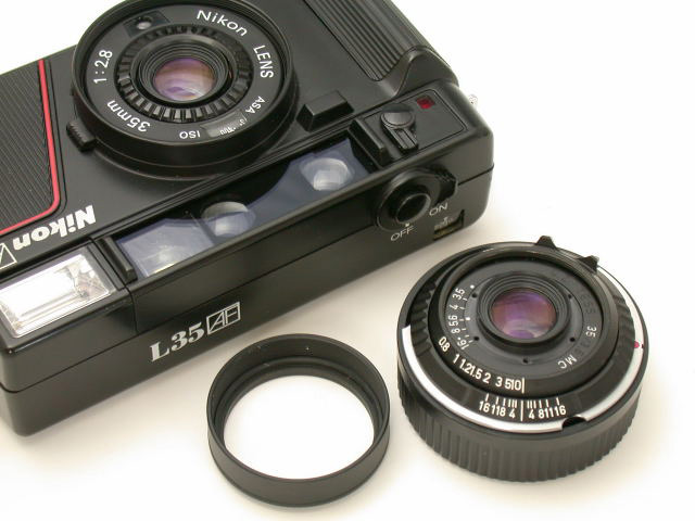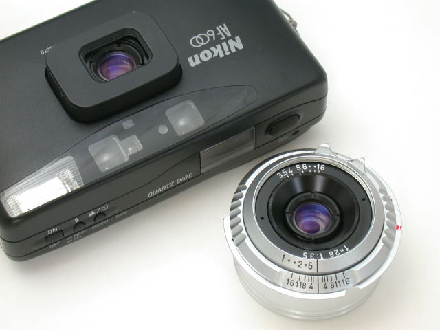 ニコンミニの愛称で親しまれたニコンのコンパクトカメラAF600は、非常にシャープな写りでも大評判でした。プラスチック製コンパクトカメラは弊社では 修理できませんが、AF600のニコン28mmF3.5レンズを取り出して宮崎がライカLマウント用に改造いたします。非常にコンパクトな姿とその写りが 魅力的です。このレンズにはドイツ製の真円絞りを組み込みます。改造費用は57,750円(消費税込み)です。改造後、宮崎が測定したデータ(実焦点距 離、収差状況等)を添付いたします。 |