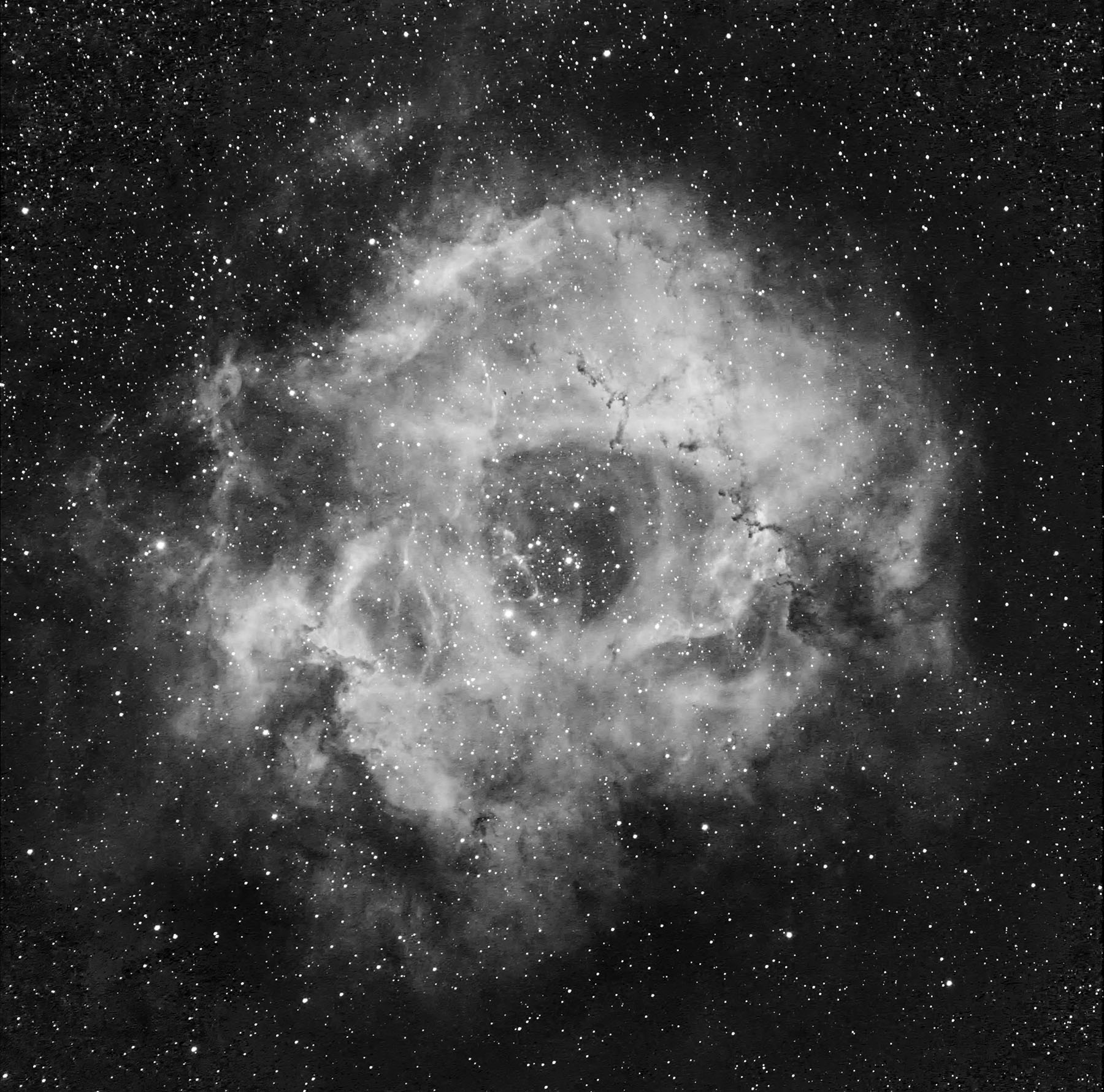 写真は神奈川県川崎市宮前区から撮影した、いっかくじゅう座のバラ星雲です(原画像はカラーですが、モノクロにしています)。3 等星がみえるかどうかという光害のひどい場所で、空の暗いところでも肉眼では観察が困難な赤い散光星雲を撮影することは、通常の方法ではまず無理なのですが、これは散光星雲の水素ガスが放出するスペクトル帯域だけを通過させる特殊な干渉膜フィルターに、通常のデジタルカメラを改造してこのスペクトル帯域の感度を高めた天体写真撮影用デジタルカメラを使用して撮影しました。