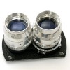 望遠レンズは、ソン・ペルチオのテレ150mmF5.5です。レンズ構成は資料がなくてわかりません。実はこの望遠レンズはきわめつきの珍品で、文献には紹介されていても実物を見ることが早田も今までできませんでした。昨秋の欧州買い付けの際、早田がフランスで初めてこのレンズに出会い、幸運にも手に入れることができたため、このような形で作例写真付きでご紹介できることになりました。上下レンズがギアで連動してピント調整するのですが、撮影レンズが焦点距離150mmなのにビューレンズは100mmです。ですから、最短撮影距離2.5mにすると撮影レンズのほうが前に出てしまうのです。またビューレンズの焦点距離が短いため、ファインダーで見えている範囲よりかなり内側しか写りません。そのためのマスクが用意されていたのか、あるいはスクリーンに撮影範囲の線を引いたのか、これもまだ謎のままです。