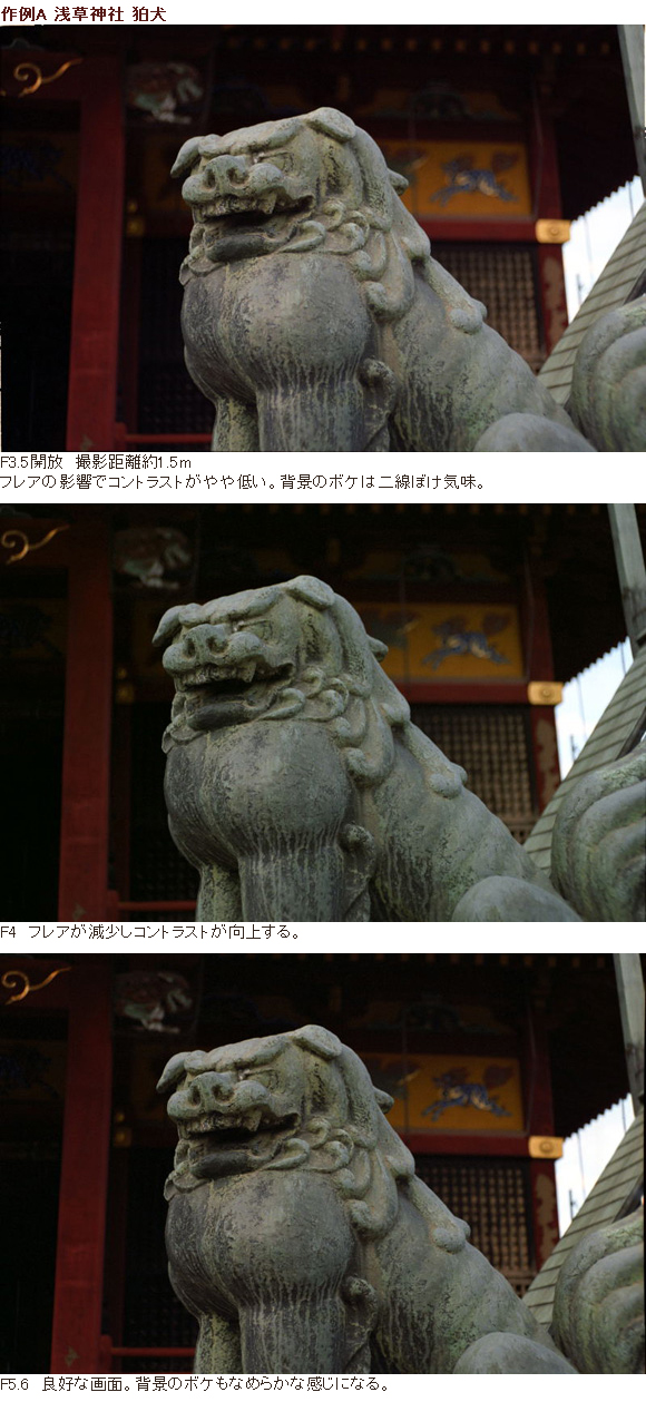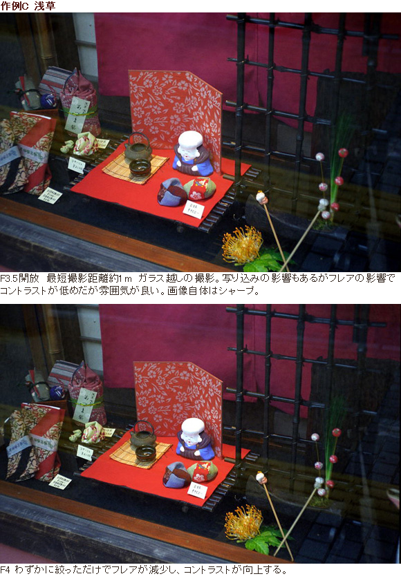 さて、今回試作品ができて参りましたので、ライカM2に装着して撮影してみました。宮崎の説明通り、F3.5開放ではフレアの影響でコントラストが低めで、その分軟らかい雰囲気の描写です。しかし解像力は高く、また画面周辺部まで安定した描写です。ただ、背景は二線ぼけ傾向が現れます。F4に絞ると急速にフレアが減少し、シャープ感が強い印象に変化します。「アポ」という名の通り、色のにじみは皆無のようです。F5.6まで絞るとコントラストが高く文句ないシャープさで、近景でも遠景でもかちっとした写真が撮影できます。F4以上に絞れば二線ぼけも目立たなくなり、きれいなボケとなります。